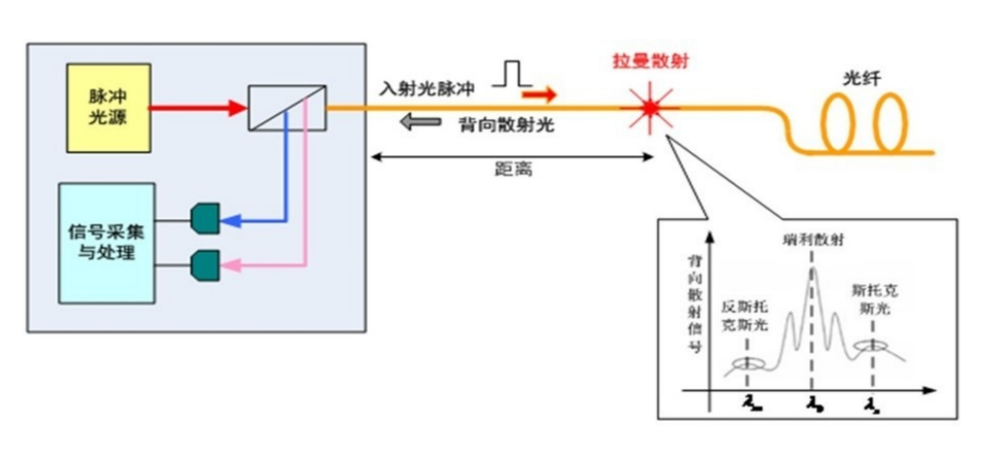 激光在光纤内部的传输过程中有一种反向拉曼散射光对温度的变化很敏感。当光纤沿线温度发生变化时,它的强度会发生变化。系统同时将光纤自身作为温度的感应器和传输介质,通过解析散射回来的反向拉曼散射光信号,即可检测出光纤沿线全程的温度分布和变化情况。同时通过采集光信号的返回时间,对温度发生变化的位置进行定位,从而达到实时监测光纤沿线温度变化并进行准确定位的目的。