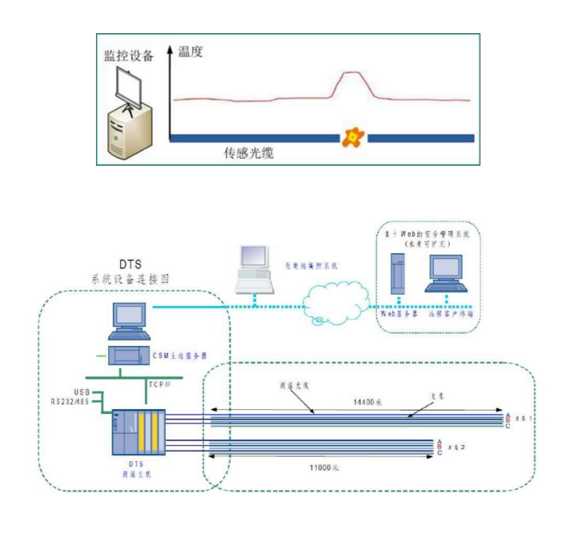分布式光纤温度监测系统是集传感、数据采集、数据处理、显示于一体的智能化高科技产品。因为主机和被测对象之间只用光纤相连,又因主机可智能化自动工作,故可在安装完成并进行系统初始化处理后便可以实现自动的温度测量、温度记录和异常温度报警等功能,实现无人值守,提高效率。该系统的最大优点是允许在单一传感器上进行数若干点的温度监测,温度监测方案灵活多变,安装施工方便,能用于工业和环境监测。