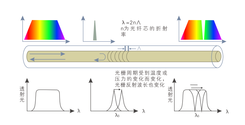 当一束宽谱光经过光纤光栅时,满足光纤光栅布拉格条件的波长将产生反射,其余的波长透过光纤光栅继续传输。温度的变化会引起光纤光栅的栅距和折射率的变化,从而使光纤光栅的反射和透射谱发生变化。通过检测光纤光栅反射谱或透射谱的变化,就可以获得相应的温度信息。