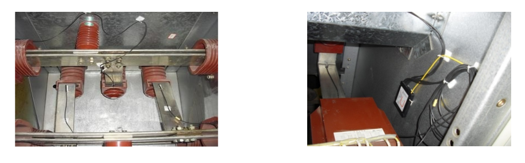 开关柜内一般上面三相和下面三相各安装1个探头,共安装6个探头。采用光纤光栅温度传感器则可以将其直接粘贴在接头等易发热部位上,实时监测测点温度的变化,实现故障的早期预测和报警,当发生故障时,提供报警并迅速准确确定故障点位置,并按相应预案采取安全处理措施。