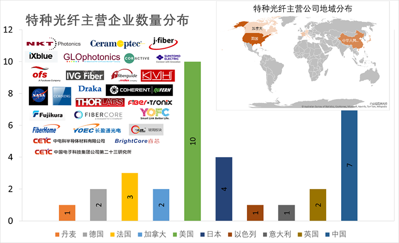 特种光纤发展的60年里,每一种光纤都有自己的发展周期,都在经历从进口到国产化的过程。如今全球主营的特纤公司达到50余家(如图8),主要集中在欧洲、美洲、亚洲地区,欧洲主营的公司有丹麦的NKT Photonics,德国J-fiber,法国GLO Photonics,英国Fiber Core等;美洲主营的公司有美国Corning、OFS、Nufern,加拿大Coractive、IVG Fiber等;亚洲主营公司主要集中在中国的长飞、烽火、jdb电子通和日本的Sumitomo、Hitachi等。