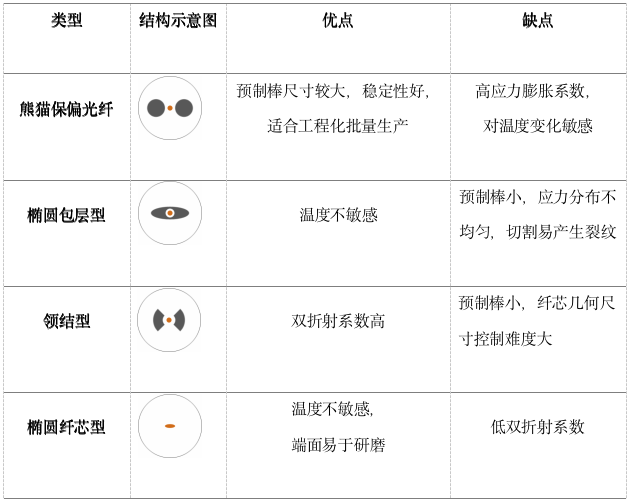 1980年以前,在光纤中实现偏振态控制,以减小偏振带来的模式色散是非常困难的。经过数十年的发展,在美国、日本和欧洲的保偏光纤技术愈渐成熟的驱动下,全球保偏光纤技术快速发展,我国的保偏光纤产品也在不断的优化和革新。保偏光纤按照结构分类主要有(如表1):熊猫型(PANDA)、领结型(bow-tie,也称为蝴蝶型)、椭圆包层型(elliptical cladding)、椭圆纤芯型(elliptical core)、扁平包层型、边槽型/边隧道型、以及扭转保偏光纤等。按照双折射系数分类,可以分成高双折射光纤(B~10-4)和低双折射光纤(B~10-9),无论高双折射还是低双折射,都存在多类型的技术方案。